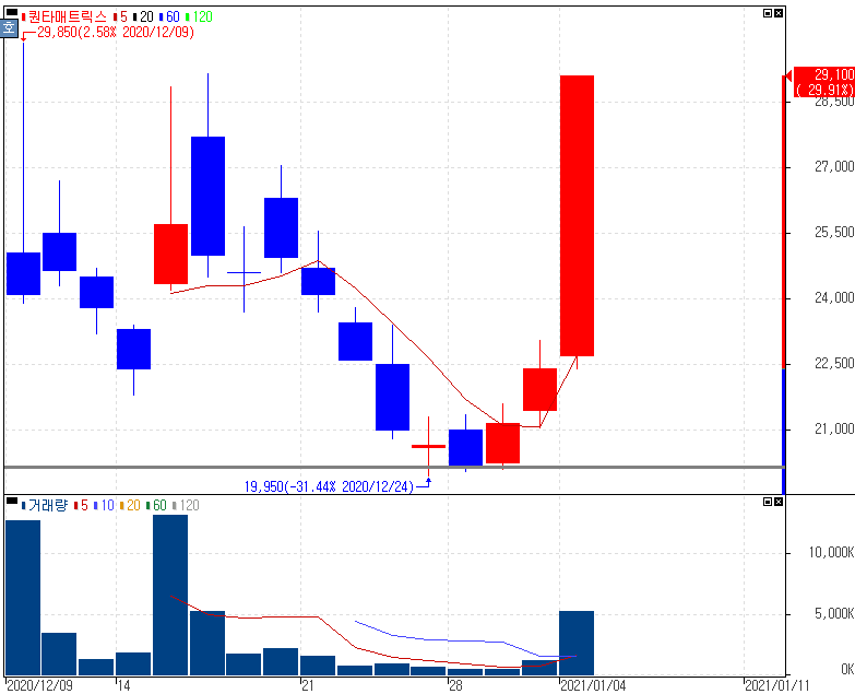 재료미노출 상한가를 기록한 퀀타매트릭스 주가 입니다. 체외진단의료기기 사업을 영위하는 업체로 차후 나올 재료를 확인이 필요합니다.
