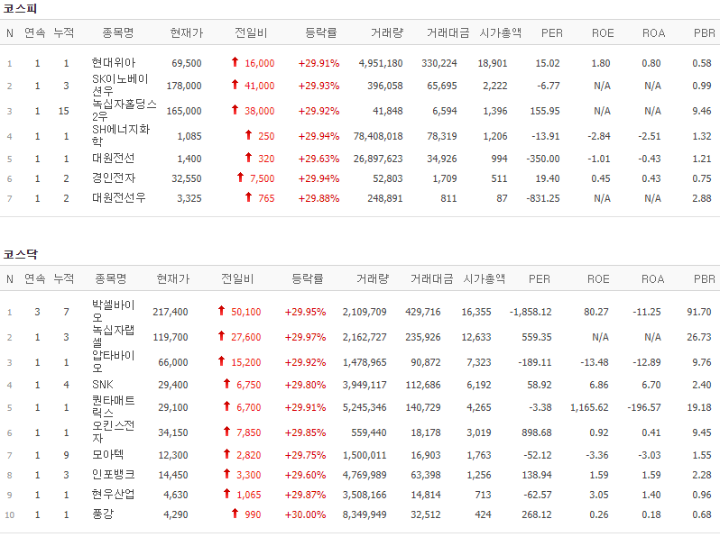 코스피에서는 현대위아, SK이노베이션우, 녹십자홀딩스2우, SH에너지화학, 대원전선, 경인전자, 대원전선우가 상한가를 기록했고, 코스닥에서는 박셀바이오, 녹십자랩셀, 압타바이오, SNK, 퀀타매트릭스, 오킨스전자, 모아텍, 인포뱅크, 현우산업, 풍강이 상한가를 기록했습니다.