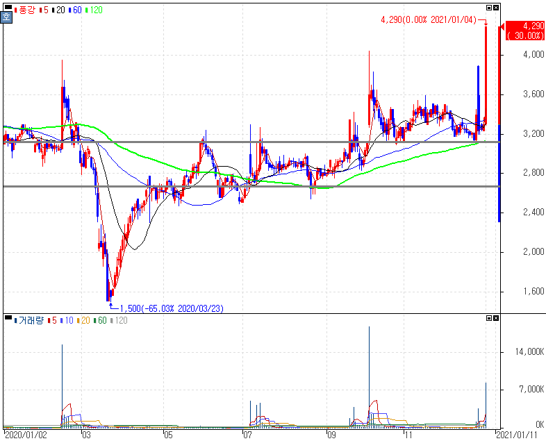 지난 8월 이후로도 안정적인 우상향을 보여준 현대위아 주가 흐름입니다. 비교적 부담을 갖지 않았다는 점에서 충분히 미래차 관련주 종목들은 충분히 있습니다. 풍강은 지난 10월에 활용했던 종목인데 이후로도 추세를 유지하면서 오늘과 같은 좋은 결과를 볼 수 있었습니다. LG화학 1차벤더로 자동차부품을 공급한다는 것으로 금일 부각된 풍강 주가 입니다.