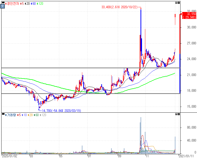 자동차 부품 관련주 상승 속 상한가를 기록한 경인전자 주가 입니다. 경인전자는 품절주 성향이 있는 종목인데 지난 10월에도 자동차 부품 종목들 상승 속에서 나왔던 상한가이였습니다. 전제적인 시장 분위기가 미래차에 주목하고 있는 만큼 부각을 보이고 있기 때문에 과거 품절주 성향이였다는 건 참고해 볼 수 있습니다.