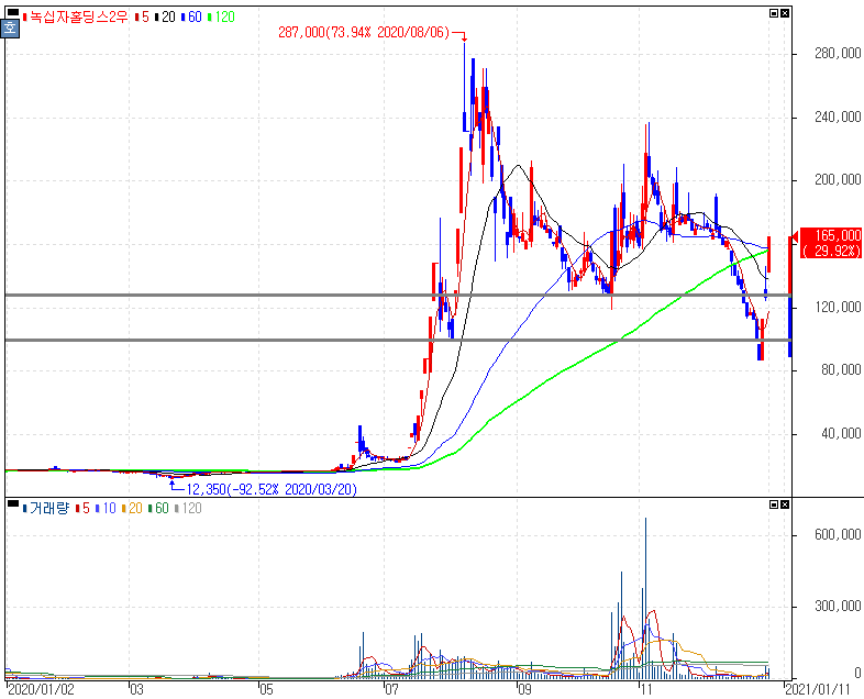 美 모더나 코로나 백신 위탁생산설 CMO에 녹십자 그룹주 강세 속 상한가를 기록한 녹십자홀딩스2우, 녹십자랩셀 주가 입니다.
