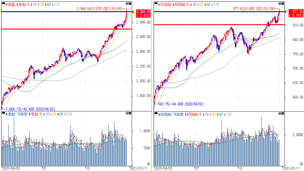 금일 코스피 지수는 +2.47% 상승한 2,944.45에 마감하였고, 코스닥 지수는 +0.95% 상승한 977.62에 마감하였습니다. 2021년 첫 거래일부터 사상 최고치를 기록했습니다.