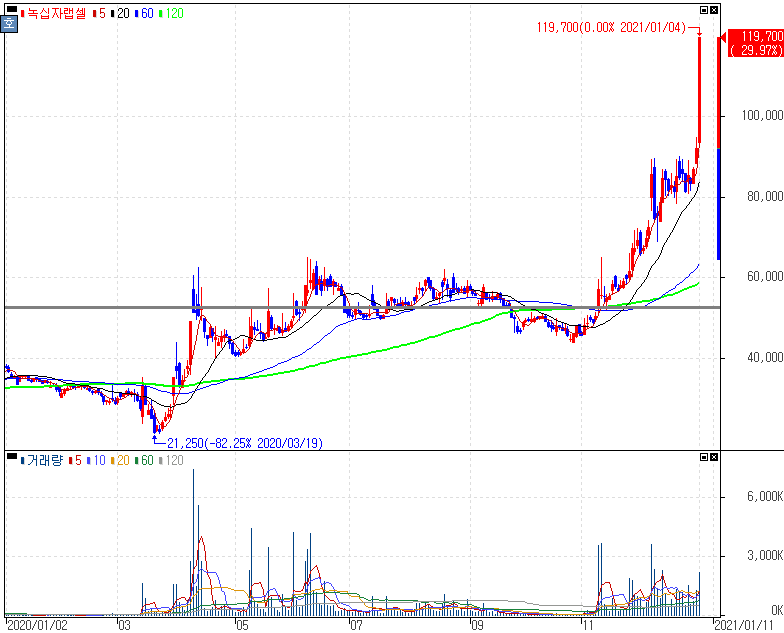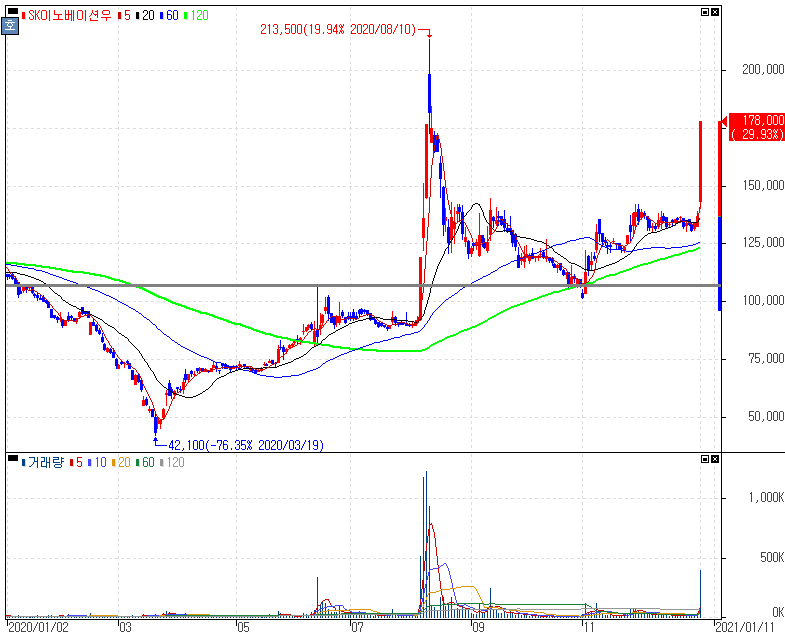 삼성SDI, 현대자동차 전기차(EV) 전용 플랫폼(E-GMP) 3차 배터리 공급사 최종 후보 선정 소식 등에 2차전지/전기차 테마주 강세 속 상한가를 기록한 SK이노베이션우 주가 입니다. 총공급 규모는 약 25조원에 달하는데 계약이 성사되면 삼성그룹과 현대차그룹의 미래 EV 사업 협력의 첫 사례가 됩니다. 지난해 각 그룹의 총수들의 협약을 위한 만남들이 하나씩 좋은 결과를 보이는 분위기입니다.