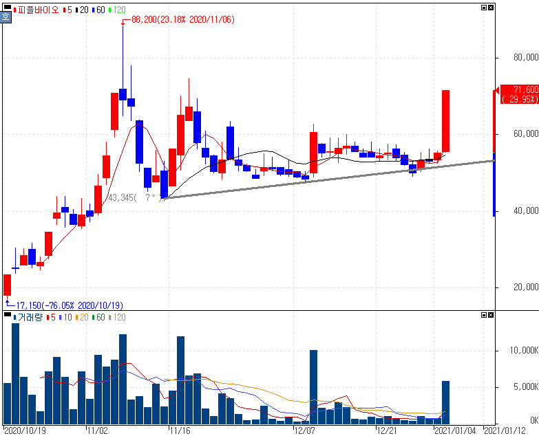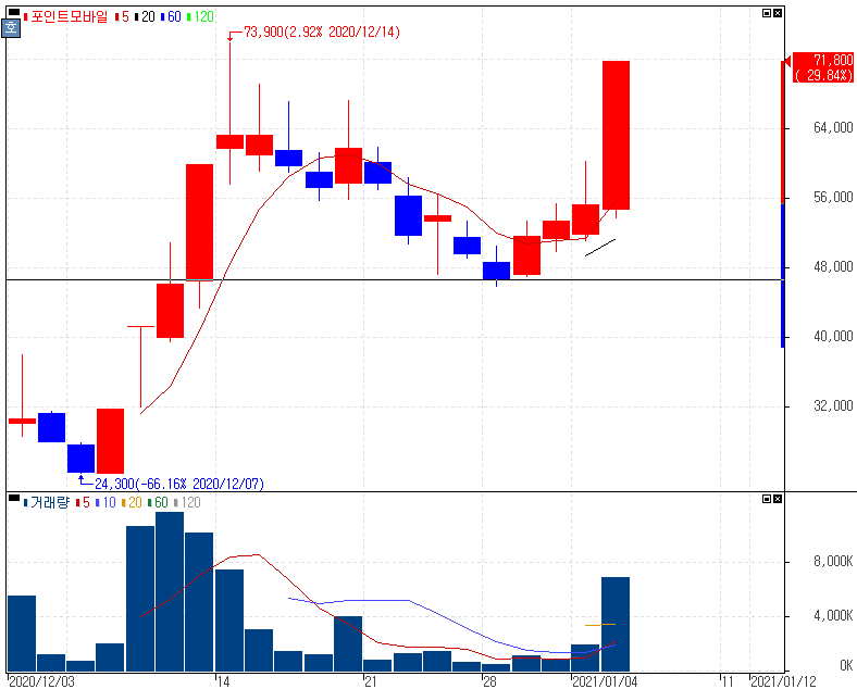 2020년 하반기 신규상장 종목 일부 강세 속 상한가를 기록한 포인트모바일, 피플바이오 주가 입니다. 각 기업의 전망 및 재료가 충분히 있는 종목입니다만 지난 미국 대선 이후 두드러지게 보여지는 흐름이라고 말씀드렸는데 새해 들어서도 이같은 양상을 보이고 있습니다. 상한가를 기록한 2020년 하반기 신규상장 종목 포인트모바일, 피플바이오 외에도 소룩스 +26.79%, 박셀바이오 +19.69% 고바이오랩 +13.46% 등 상승 마감을 보였습니다.