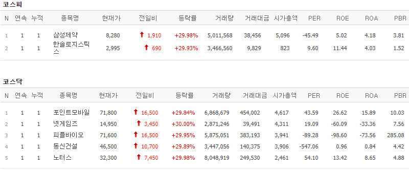 코스피에서는 삼성제약, 한솔로직스틱스가 상한가를 기록했고, 코스닥에서는 포인트모바일, 넷게임즈, 피플바이오, 동신건설, 노터스가 상한가를 기록했습니다.
