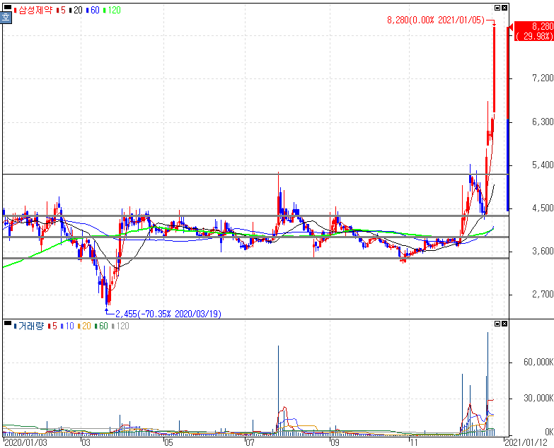 구충제 이버멕틴 코로나19 치사율 하락 효과 소식에 상한가를 기록한 삼성제약, 노터스 주가 입니다. 구충제 이버멕틴이 코로나19 중증환자의 치사율을 80% 가량 낮춰주는 효과 소식이 나왔죠. 리버풀대학교 WHO 의뢰를 받아 아르헨티나, 이집트, 방글라데시 등에서 이버멕틴을 투여한 573명 중 8명이 숨진 반면, 위약을 투여한 510명 중 44명이 사망했다는 소식에 부각을 보이고 있습니다.