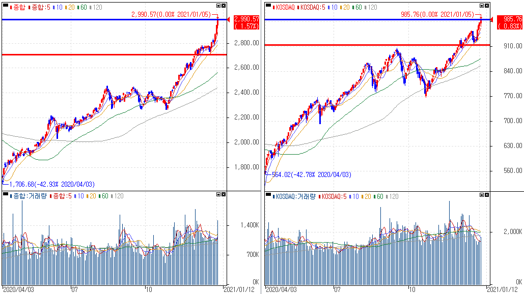 금일 코스피 지수는 +1.57% 상승한 2,990.57에 마감하였고, 코스닥 지수는 +0.83% 상승한 985.76에 마감하였습니다. 주의를 기울이라는 언론매체들의 자료들이 있으나 개인의 순매수가 강하게 보여주면서 오늘도 상승 마감하였습니다.