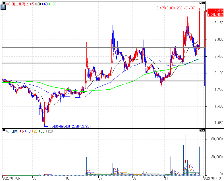 김관묵 교수팀, 세계 최초 아미노산 자동화 생산기술 개발 소식 속 시장에서 부각되며 상한가를 기록한 아미노로직스 주가 입니다. 김관묵 이화여자대학교 화학‧나노과학전공 교수팀이 에이즈 치료제, 항암제 등 고부가가치 의약품 원료로 쓰이는 비천연 아미노산을 액-액 추출공정으로 L-D 변환하는 기술을 세계 최초로 개발했다는 소식이 나왔는데 아미노로직스가 비천연 아미노산 제조사업을 영위하면서 김관묵 연구팀의 과거 아미노산 관련 기술이전을 받은 것으로 부각된 모습입니다.