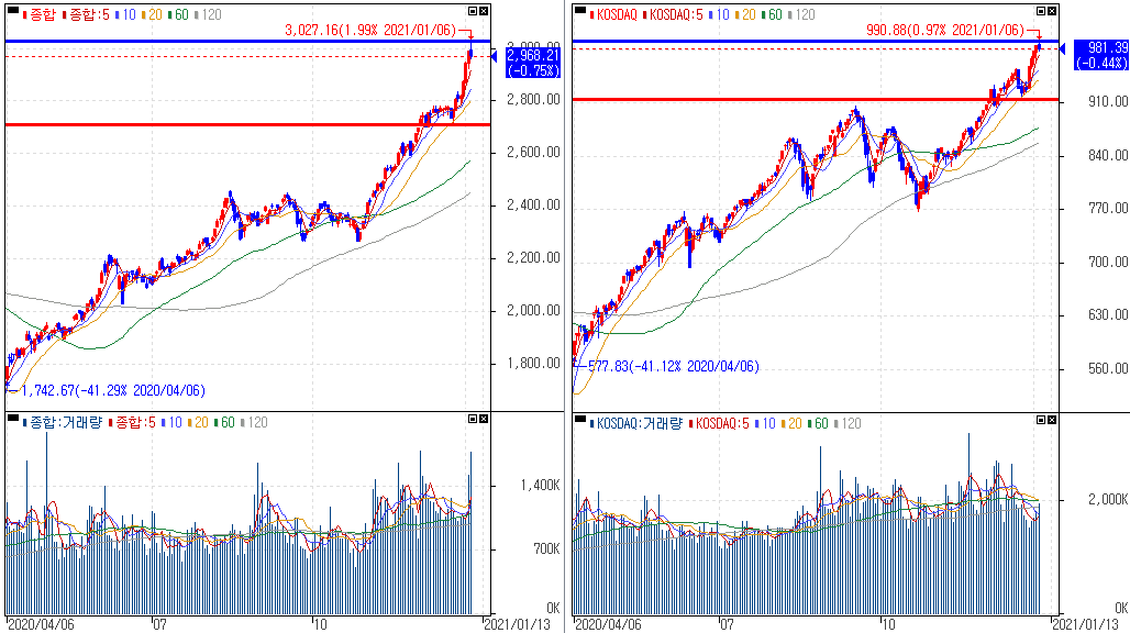 금일 코스피 지수는 -0.75% 하락한 2,968.21에 마감하였고, 코스닥 지수는 -0.44% 하락한 981.39에 마감하였습니다. 국내증시는 3,000선과 990선이 심리선인만큼 정체된 모습을 쉽게 볼 수 있는데 심리적인 관점에서 저항구간에서의 무리한 투자보다는 안정적으로 환기시킬 수 있는 지점으로 생각해야 합니다.