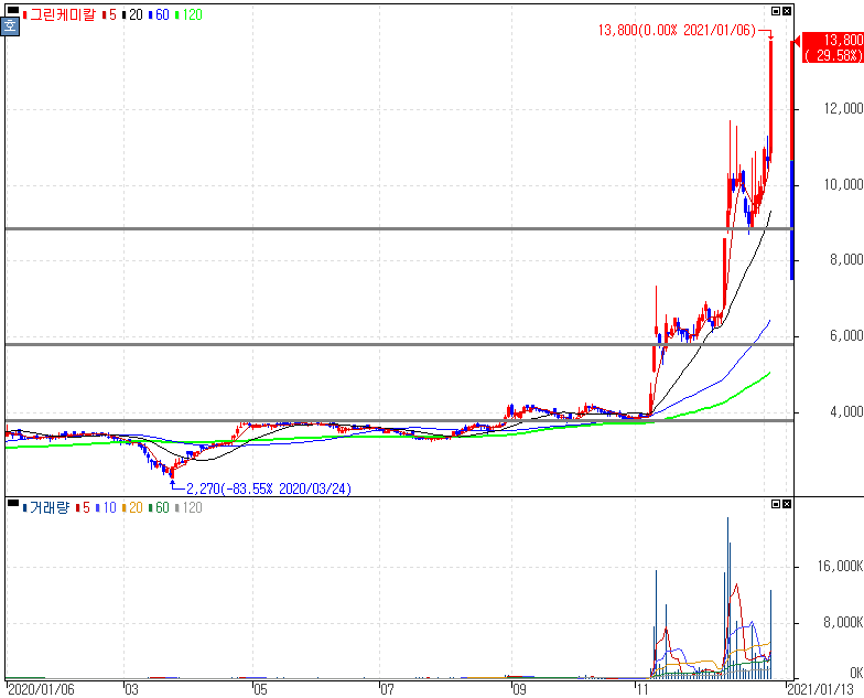 美 조지아 연방상원 결선 개표 초반 민주당 우세 속 바이든 시대 탄소중립 종목 일부 상승 속 상한가를 기록한 그린케미칼 주가 입니다. 탄소중립, 탄소배출권이라고 하죠. 바이든 정부가 그린뉴딜로 탄소중립, 탄소배출권을 내세우면서 주식시장에서는 이미 그린뉴딜에 대해 탄소중립, 탄소배출권에 이목을 받아왔습니다. 또한 현 文 정권에서도 그린뉴딜정책으로 '2050 탄소중립'을 추진전략으로 내세우고 있는 만큼 해당 관련 종목들의 긴 상승세를 보였다는 것을 알 수 있습니다.