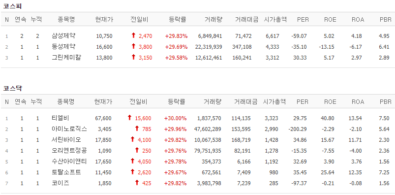 코스피에서는 삼성제약, 동성제약, 그린케미칼이 상한가를 기록했고, 코스닥에서는 티엘비, 아미노로직스, 서린바이오, 오리엔트정공, 수산아이앤티, 토탈소프트, 코이즈가 상한가를 기록했습니다.