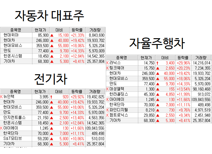 이와 같은 영향으로 티엔에이치엔, 뉴인텍, 현대위아, 현대차, 현대모비스 등 자동차대표주, 자동차 부품, 미래차 관련 종목군의 강세 흐름