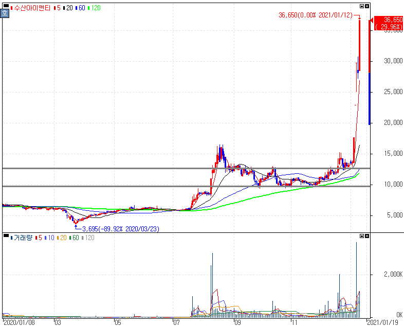 대선 테마, 이재명 관련주 일부 상승 속 상한가를 기록한 수산아이앤티 주가 입니다. 최근 3배 이상 상승률을 보이고 있는 정치테마주로 추가 상승을 보이더라도 유의하시길 바랍니다.