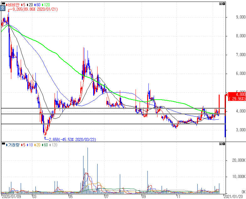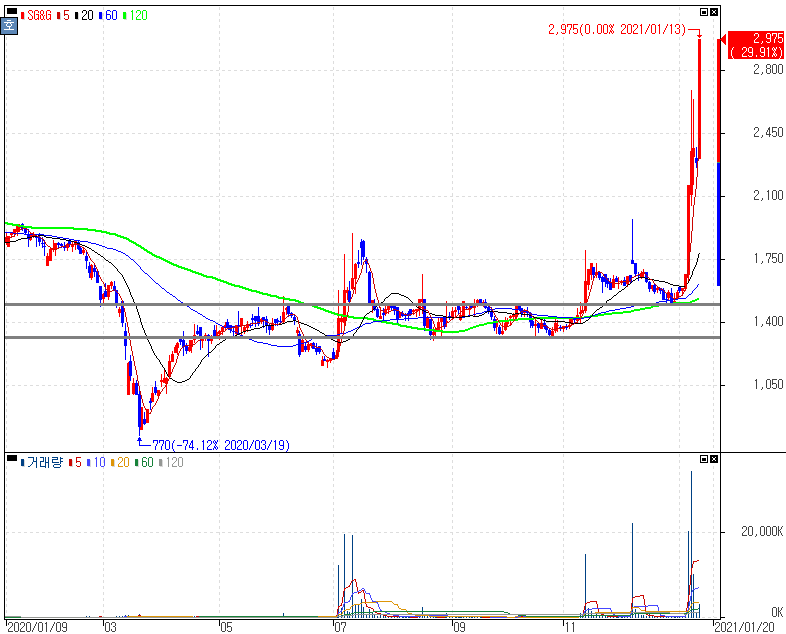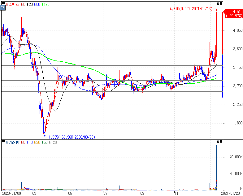 쿠팡 나스닥 상장 예비심사 통과 소식 속 쿠팡플레이에 흥행작 공급사실 부각에 상한가를 기록한 쇼박스 주가 입니다. 쿠팡과 연관된 종목에 대해서는 지속적으로 추가되는 모습입니다. 쇼박스는 많은 분들이 아시겠지만 영화 제작과 투자, 배급업을 영위하다보니 코로나19로 인해 집적적으로 타격을 받았던 업종입니다. 최근 쿠팡플레이가 부각을 보이면서 연관종목으로 상승을 했습니다만 코로나19 백신접종 일정이 점차 구체화되면서 컨택트 업종의 투자심리 개선 흐름을 보인다는 점도 참고할 수 있습니다.