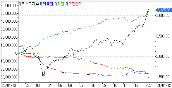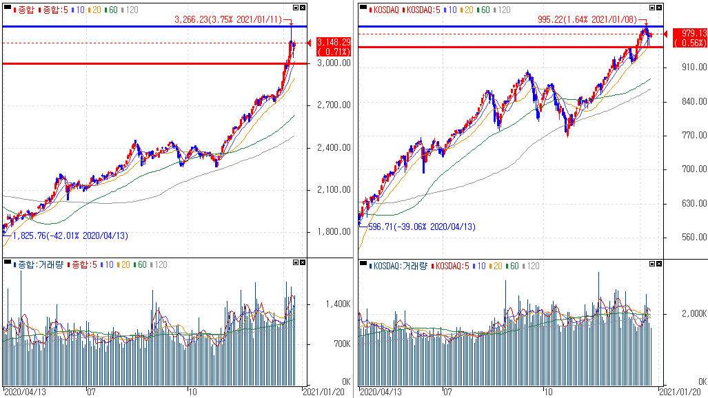 금일 코스피 지수는 +0.71% 상승한 3,148.29에 마감하였고, 코스닥 지수는 +0.56% 상승한 979.13에 마감하였습니다. 그동안 이어져온 개인투자자의 매수세에 외국인도 합세하면서 상승마감을 보였습니다. 지난 2020년은 시장 하락 우려의 목소리가 많았음에도 불구하고 새해 들어서까지 긴 상승장을 보였죠. 올해도 시장하락우려 목소리가 어김없이 나오고 있는데 이미 하락하고나서 후회하는건 소용 없다는 것을 잘 기억하시길 바랍니다.