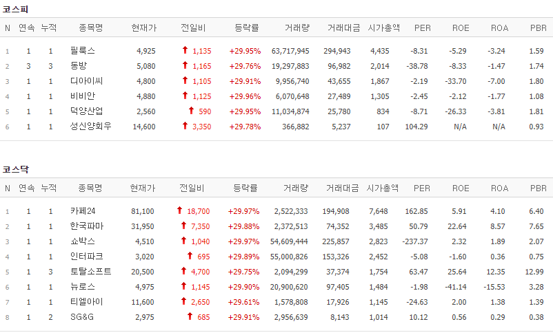 코스피에서는 필룩스, 동방, 디아이씨, 비비안, 덕양산업, 성신양회우가 상한가를 기록했고, 코스닥에서는 카페24, 한국파마, 쇼박스, 인터파크, 토탈소프트, 뉴로스, 티엘아이, SG&G가 상한가를 기록했습니다.
