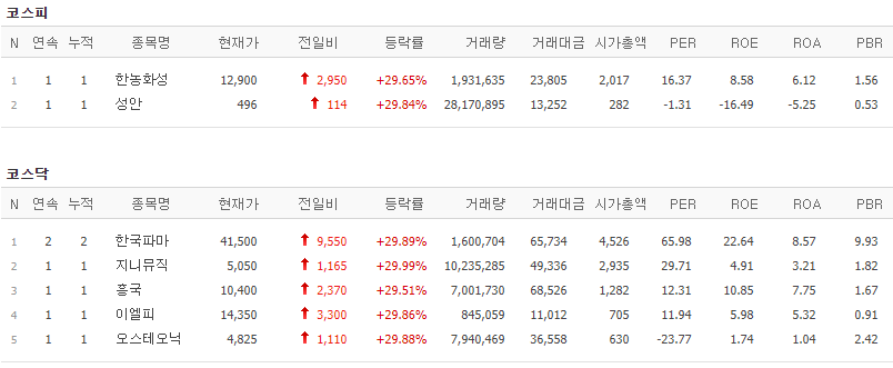 코스피에서는 한농화성, 성안이 상한가를 기록했고, 코스닥에서는 한국파마, 지니뮤직, 흥국, 이엘피, 오스테오닉이 상한가를 기록했습니다.