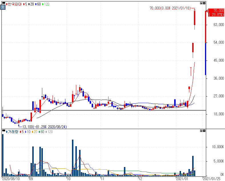 코로나19 치료제 인도 임상2상 완료 모멘텀 지속에 상한가를 기록한 필룩스, 한국파마 주가 입니다. 한국파마에서 생산한 코로나19 치료제가 인도에서 임상2상 완료했다는 소식으로 한국파마는 4거래일 연속 상한가를 기록하고 있습니다. 해당 코로나19 치료제는 경증 및 중증 환자 투약 6일만에 95% 회복 치료효과를 기대하는 결과를 보이면서 비교적 높은 관심을 받고 있습니다. 이에 따라 임상2상을 진행했던 경희대와 제넨셀 가운데 필룩스가 인도 제넨셀과 전략적 제휴를 맺고 있으면서 동반 상한가를 기록했습니다.
