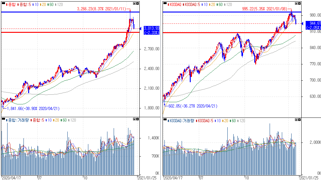 금일 코스피 지수는 -2.33% 하락한 3,013.93에 마감하였고, 코스닥 지수는 -2.05% 하락한 944.67에 마감하였습니다.
