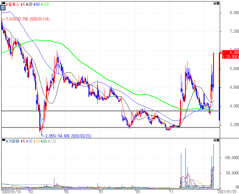 코로나19 치료제 인도 임상2상 완료 모멘텀 지속에 상한가를 기록한 필룩스, 한국파마 주가 입니다. 한국파마에서 생산한 코로나19 치료제가 인도에서 임상2상 완료했다는 소식으로 한국파마는 4거래일 연속 상한가를 기록하고 있습니다. 해당 코로나19 치료제는 경증 및 중증 환자 투약 6일만에 95% 회복 치료효과를 기대하는 결과를 보이면서 비교적 높은 관심을 받고 있습니다. 이에 따라 임상2상을 진행했던 경희대와 제넨셀 가운데 필룩스가 인도 제넨셀과 전략적 제휴를 맺고 있으면서 동반 상한가를 기록했습니다.