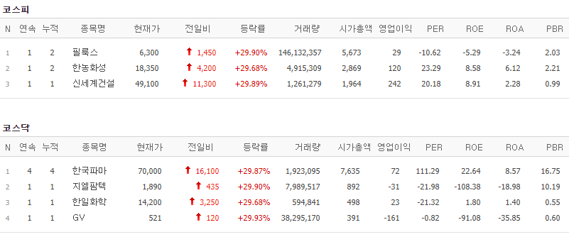코스피에서는 한농화성이 상한가를 기록했고, 코스닥에서는 한국파마, 국전약품, 지엘팜텍, 한일화학, GV가 상한가를 기록했습니다.