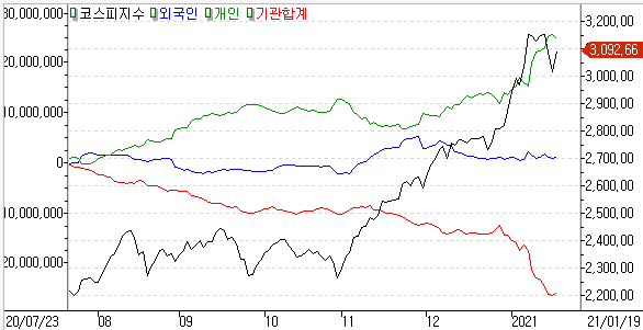 금일 코스피 지수는 +2.61% 상승한 3,092.66에 마감하였고, 코스닥 지수는 +1.38% 상승한 957.75에 마감하였습니다. 기관의 순매수세가 돌아오면서 꽤 상승했죠. 뉴욕증시가 휴장이다보니 큰 영향없이 상승을 보였는데 안심할 수는 없습니다.