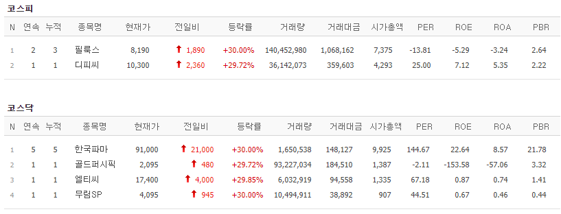 코스피에서는 필룩스, 디피씨가 상한가를 기록했고, 코스닥에서는 한국파마, 골드퍼시픽, 엘티씨, 무림SP가 상한가를 기록했습니다.