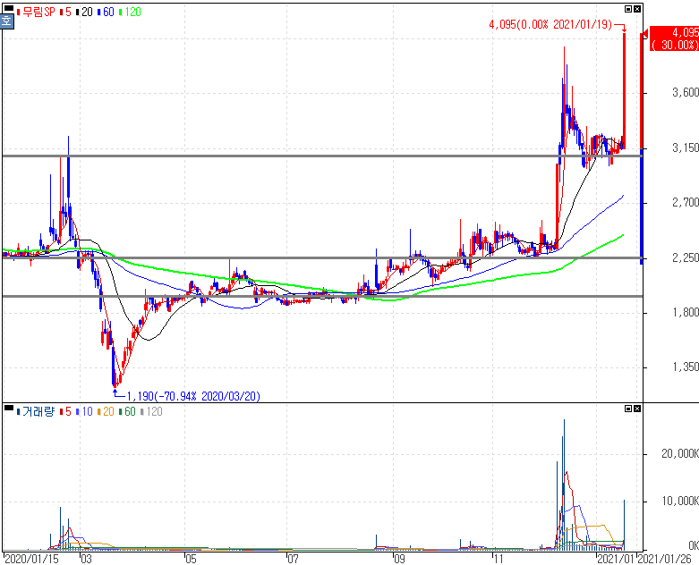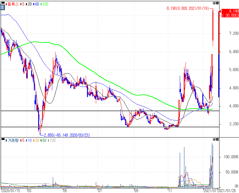 코로나19 치료제 인도 임상2상 완료 모멘텀 지속에 상한가를 기록한 필룩스, 한국파마, 골드퍼시픽 주가 입니다. 한국파마가 생산하고 있는 코로나19 치료제에 대해서는 지난주부터 상승세가 이어지면서 한국파마는 5거래일 연속 상한가를 기록하고 있습니다. 경증 및 중증 환자 대상으로 투약한 치료제가 6일만에 95% 회복 치료효과를 기대하는 결과가 나왔기 때문에 다른 치료제에 비해 월등히 좋은 기대치를 보여주었기 때문이죠.