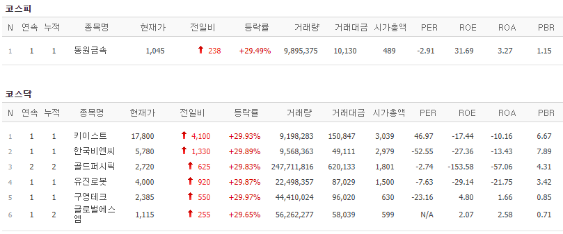 코스피에서는 동원금속이 상한가를 기록했고, 코스닥에서는 키이스트, 한국비엔씨, 골드퍼시픽, 유진로봇, 구영테크, 글로벌에스엠이 상한가를 기록했습니다.
