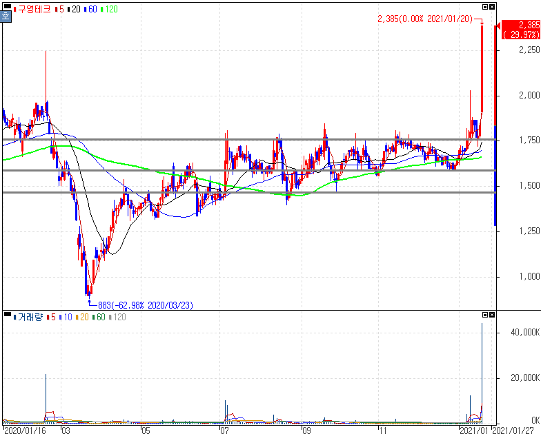 이는 애플카와 관련해 꼭 정보를 얻어야만 좋은 종목을 얻을 수 있는 것이 아니라, 상승으로 이어지는 흐름을 잘 파악하고 분석한다면 얻을 수 있는 종목입니다. 동원금속은 자동차부품주로 현대·기아차와 밀접한 협력업체 관계도 확인하고 참고하시길 바랍니다. 유진로봇은 자율주행차(애플카) 테마로 부각을 보였으며, 구영테크 또한 자동차부품으로 부각을 받아 동반 상한가를 기록했습니다.