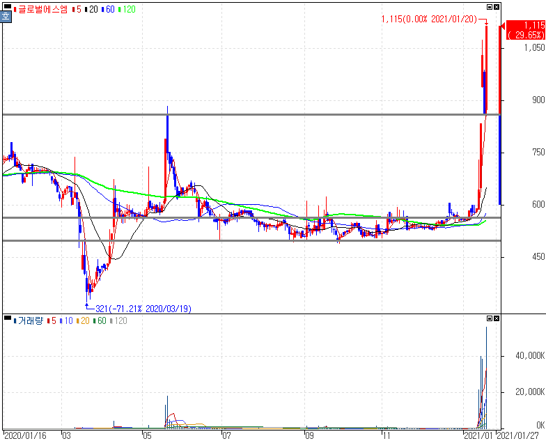 이재명 경기도지사, 차기 대선주자 지지율 1위 모멘텀 지속에 상한가를 기록한 글로벌에스엠 주가 입니다. 어제 윤석열 검찰총장이 어떤 정치인과 대결하더라도 승리한다는 여론조사의 결과가 나왔습니다. 이는 충분히 여론조사회사의 특성 및 여론조사 방법에 따라서 오차 및 달라질 수 있는 여론조사의 결과입니다.