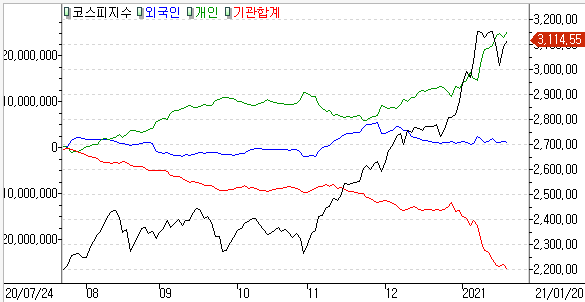 코스피 개인 +14,368억 / 외국인 -2,368억 / 기관 -12,345억 코스닥 개인 -4,501억 / 외국인 +2,675억 / 기관 +2,147억