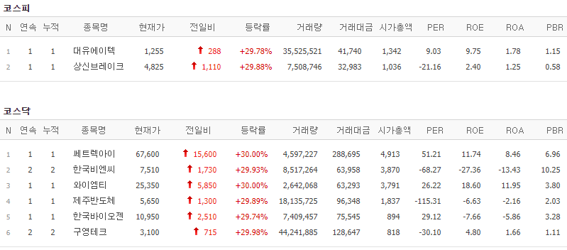 코스피에서는 대유에이텍, 상신브레이크가 상한가를 기록했고, 코스닥에서는 쎄트렉아이, 한국비엔씨, 와이엠티, 제주반도체, 한국바이오젠, 구영테크가 상한가를 기록했습니다.
