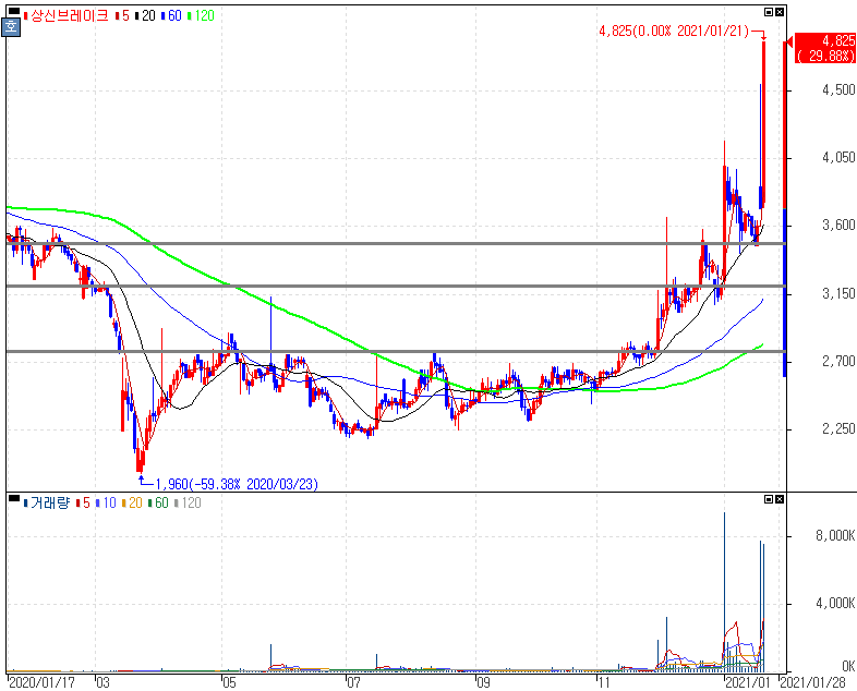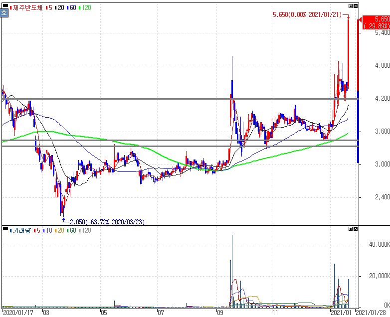 반도체·승용차 1월 1~20일 수출 호조 및 화이자 코로나19 백신 용기에 메모리반도체 공급 소식에 상한가를 기록한 제주반도체 주가 입니다. 제주반도체는 256(Mb) 메모리 용량 D램을 화이자 코로나19 백신 보관용기에 들어가는 콘트롤센서에 적용한다는 소식입니다.