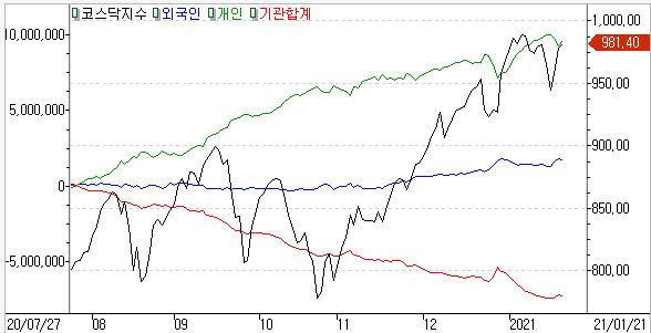 코스닥 개인 +3,629억 / 외국인 -1,356억 / 기관 -1,727억