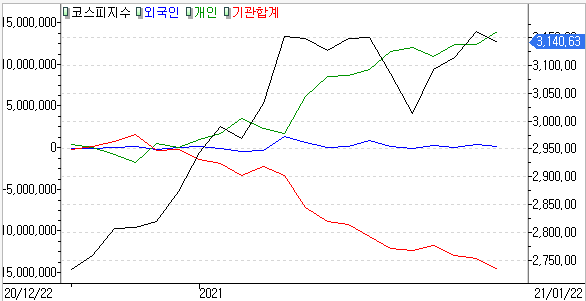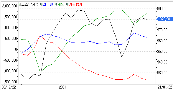 지난주 2021년 01월 18일부터 01월 22일 1주일간 외국인/개인/기관 순매수/순매도 거래동향은 코스피와 코스닥에서 외국인의 순매수를 볼 수 있었지만 반대로 기관이 양시장에서 순매도세를 보였다는 것이 특징입니다.
