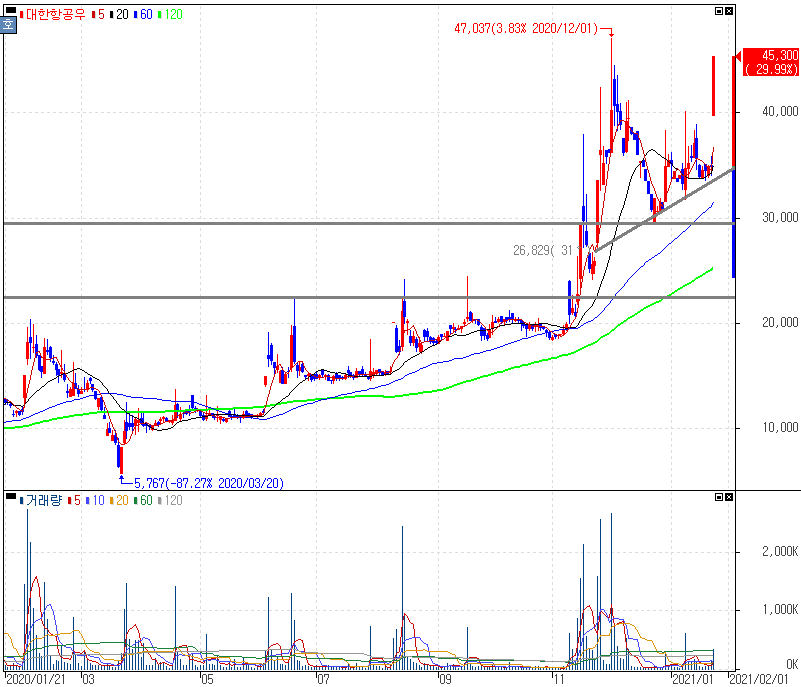 유상증자 권리락 효과 발생 등에 상한가를 기록한 대한항공우 주가 입니다. 코로나19로 인해 글로벌 항공사들의 적자 영업이익 직격탄을 맞았으나 대한항공의 경우 화물기 활용으로 영업이익은 흑자를 다시 한번 보여줄 것이라는 기대감을 가지고 있는 상황입니다. 보통주 대한항공은 +11.99% 상승으로 마감하였습니다.