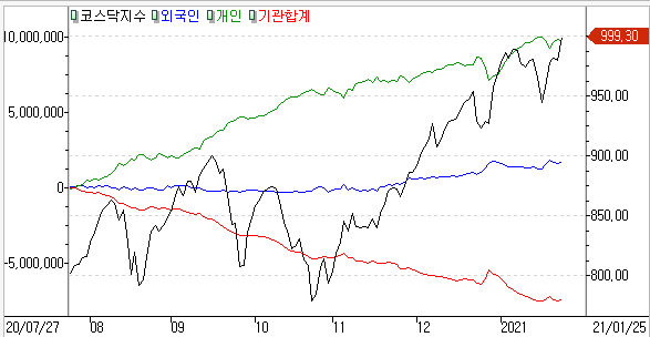 코스닥 개인 -1,621억 / 외국인 +835억 / 기관 +899억