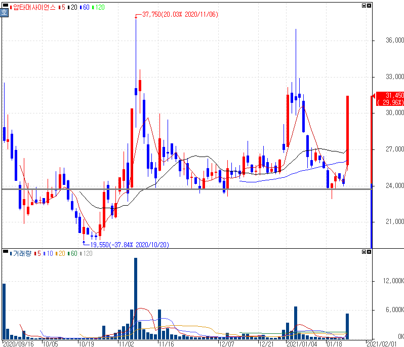 개발중인 코로나19 치료제 렘데시비르 대비 최대 100배 효능 확인 소식 등에 상한가를 기록한 압타머사이언스 주가 입니다. 압타머사이언스가 코로나19 신속진단키트와 치료제 개발 진행 경과에 발표하면서 "렘데시비르 대비 최대 100배까지 우수한 항바이러스 효과를 확인했다"고 밝히면서 부각을 받았습니다.