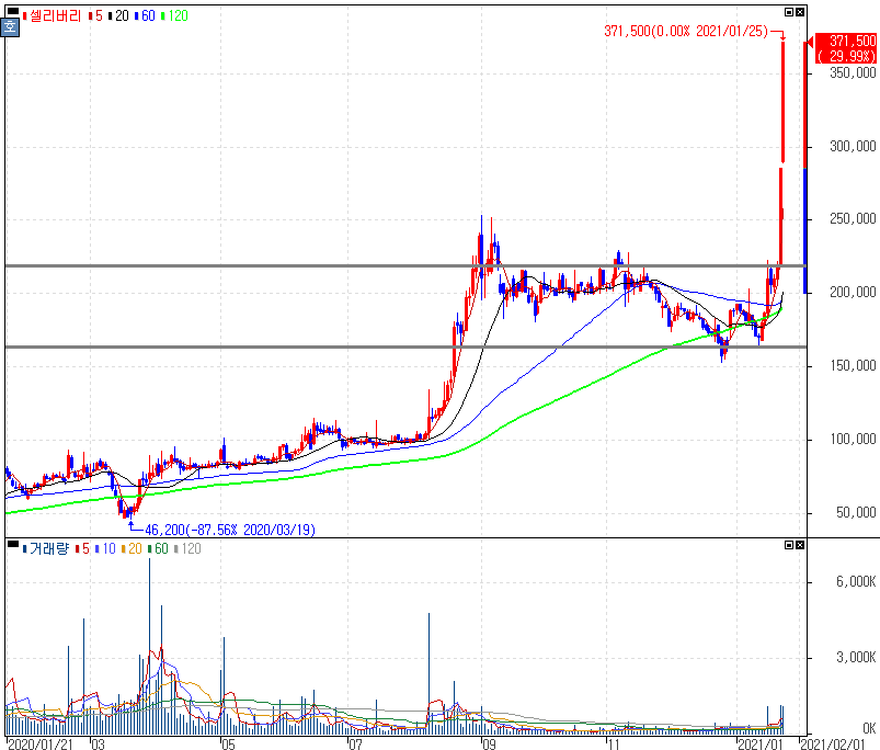 무상증자 결정 소식에 2거래일 연속 상한가를 기록한 셀리버리 주가 입니다. 지난주 셀리버리는 주당 1주 (100%) 무상증자 소식에 상한가를 기록하고 오늘도 연속 상한가를 보여준 모습입니다. 배정긴준일은 2월2일이고, 상장예정일은 2월 24일 입니다.