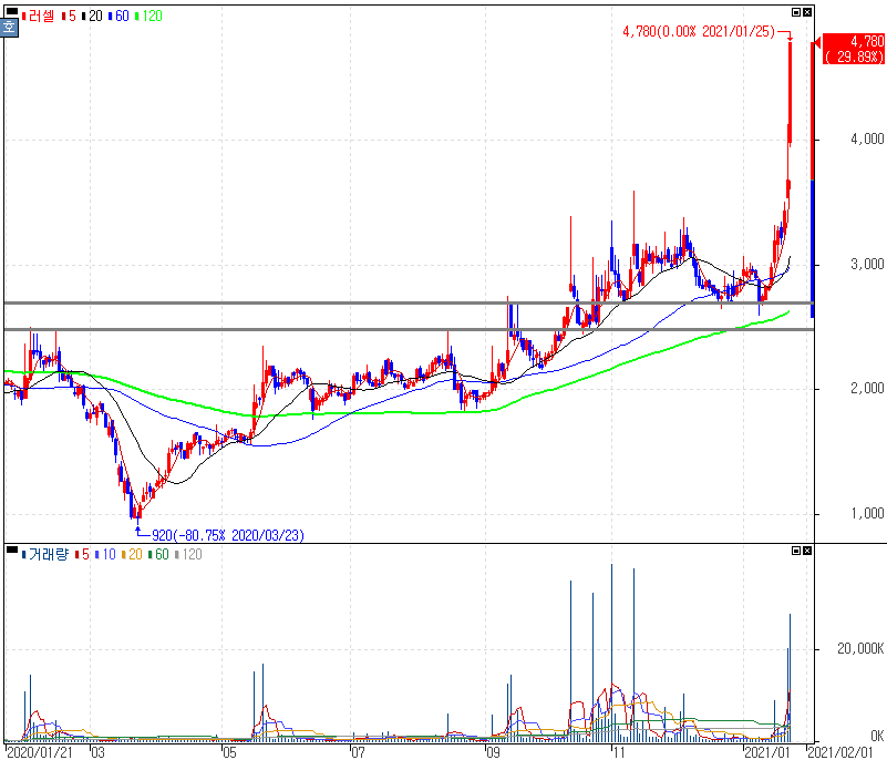 파운드리, 반도체 중고장비 업황 호조에 따른 실적 호조 전망 등에 상한가를 기록한 러셀 주가 입니다. 파운드리 업황 호조와 8인치 중고 장비 공급 부족 심화로 인한 수혜를 대신증권은 전망했습니다.