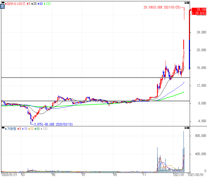 신작 '쿠키런:킹덤' 흥행에 2거래일 연속 상한가를 기록한 데브시스터즈 주가 입니다. 지난주도 상한가를 보였던 데브시스터즈가 연속 상한가를 기록하고 있습니다. 데브시스터즈의 주요주주인 NHN엔터(NHN)은 0.41% 마감, 컴투스 +1.80% 마감을 보였습니다.