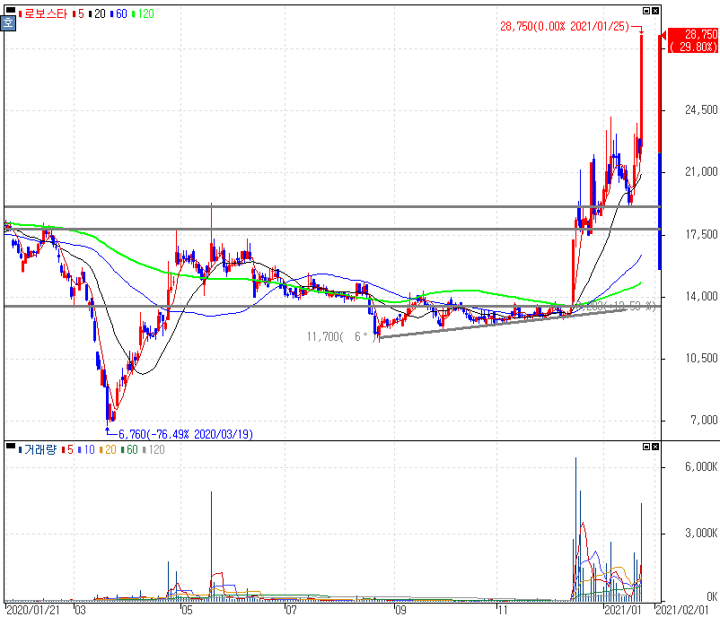 LG전자, 미래 먹거리 로봇 사업 선정 소식에 로봇, 인공지능 관련주 상승 속 상한가를 기록한 로보스타 주가 입니다. LG전자 '로봇 사업'을 미래 사업 중 하나로 낙점하면서 비대면 방역로봇 LG 클로이 살균봇 시연 등 로봇과 연관된 사업 기대감과 함께 인공지능, 로봇 관련주가 상승을 보였습니다.