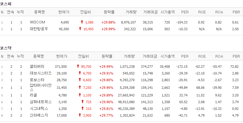 코스피에서는 WISCOM, 대한항공우가 상한가를 기록했고, 코스닥에서는 셀리버리, 데브시스터즈, 로보스타, 압타머사이언스, 러셀, 삼화네트웍스, 시그네틱스, 신라에스지가 상한가를 기록했습니다.
