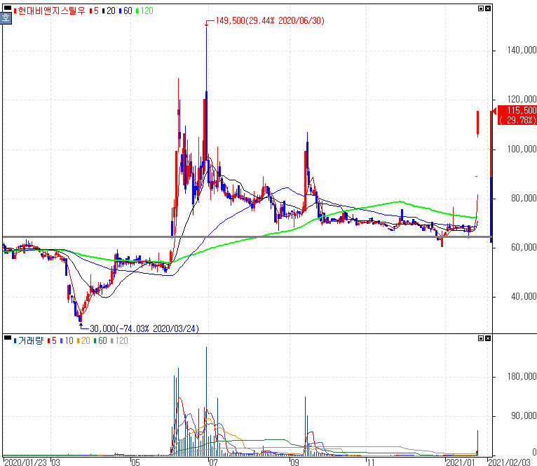 LG하우시스 자동차소재 사업부 인수 소식에 2거래일 연속 상한가를 기록하고 있는 현대비앤지스틸, 현대비앤지스틸우 주가 입니다. 최근 크게 주목을 받고 있는 자동차 산업에서의 소재, 산업용필름 사업부를 인수하는 현대비앤지스틸은 1분기 내로 본계약 체결 계획을 가지고 있습니다.