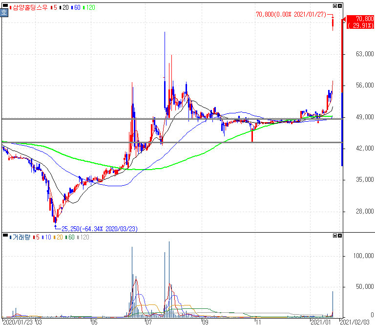 삼양바이오팜 흡수합병 결정에 상한가를 기록한 삼양홀딩스우 주가 입니다. 경영 효율성 제고 및 경쟁력 강화 목적으로 자회사 삼양바이오팜을 흡수합병하기로 결정한 삼양홀딩스 입니다. 합병기일은 2021년 4월 01일입니다. 보통주 삼양홀딩스는 +7.07% 상승마감, 자회사 삼양사 +1.69% 상승마감, 삼양사우 +1.11% 상승마감하였습니다.