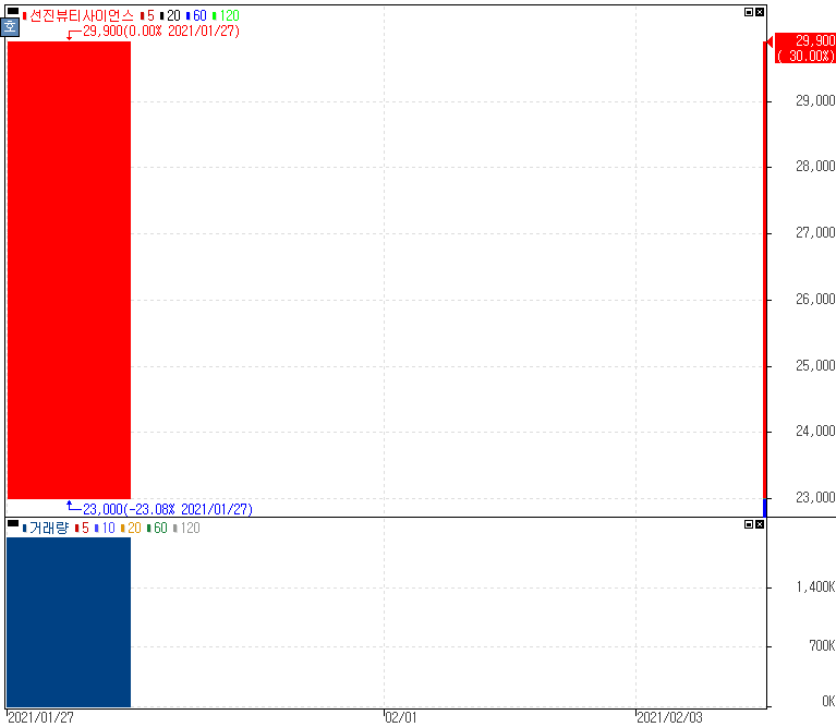 금일 신규상장 첫 날 상한가를 기록한 선진뷰티사이언스 주가 입니다. 공모가 11,500원을 상회한 23,000원에서 시초가를 형성해 +30.00% 상승 상한가를 기록한 선진뷰티사이언스는 화장품원료와 화장품제조, 판매업을 영위하고 있는 업체입니다. 마침 어제 한중 정상 전화통화를 통해서 중국소비주, 국내상장중국 관련주가 상승을 보였었습니다. 오늘 이후로도 계속 신규상장 종목들이 있기 때문에 1월 증시 일정도 반드시 확인해보시길 바랍니다.