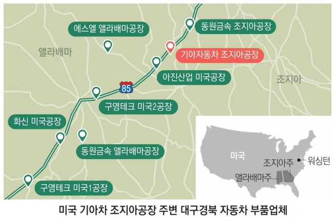 관련 보도자료에서는 미국 조지아주와 앨라배마 주 사이의 85번 국도에 있는 기아 조지아공장을 중심으로한 동원금속, 에스엘, 아진산업, 구영테크, 화신 등 대구경북 5개 업체의 7개 공장이 위치했다는 것으로 동반 상승을 보이기도 했습니다.