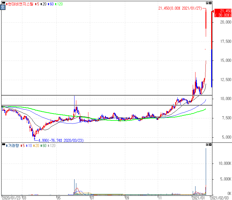 LG하우시스 자동차소재 사업부 인수 소식에 2거래일 연속 상한가를 기록하고 있는 현대비앤지스틸, 현대비앤지스틸우 주가 입니다. 최근 크게 주목을 받고 있는 자동차 산업에서의 소재, 산업용필름 사업부를 인수하는 현대비앤지스틸은 1분기 내로 본계약 체결 계획을 가지고 있습니다.