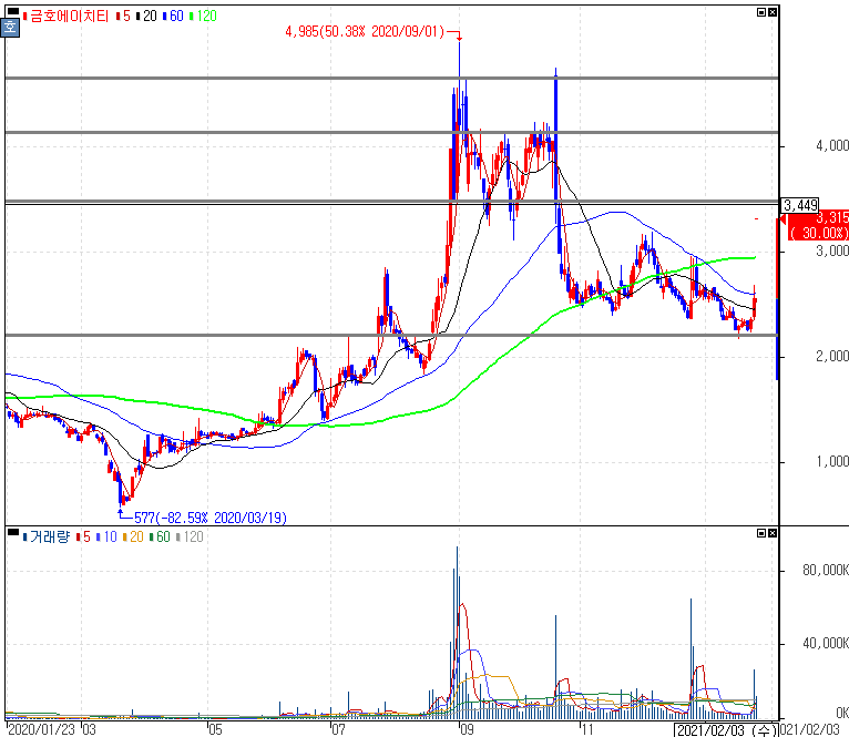 다이노나 흡수합병 결정에 상한가를 기록한 금호에이치티 주가 입니다. 안정적인 현금창출력과 다이노나가 보유한 항체치료제 파이프라인의 결합을 통한 차세대 성장동력의 확보 목적으로 금호에이치티는 다이노나를 흡수하기로 결정했습니다.